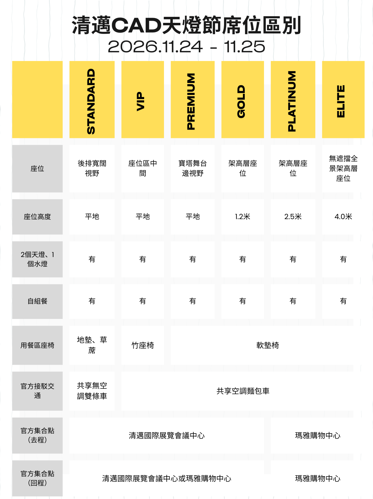 The Standard seat ticket | Standard Plus seat ticket | VIP seat ticket | Premium seat ticket | Platinum seat ticket | Elite ticket options differ in terms of seating location, meal provisions, dining areas, and souvenirs.