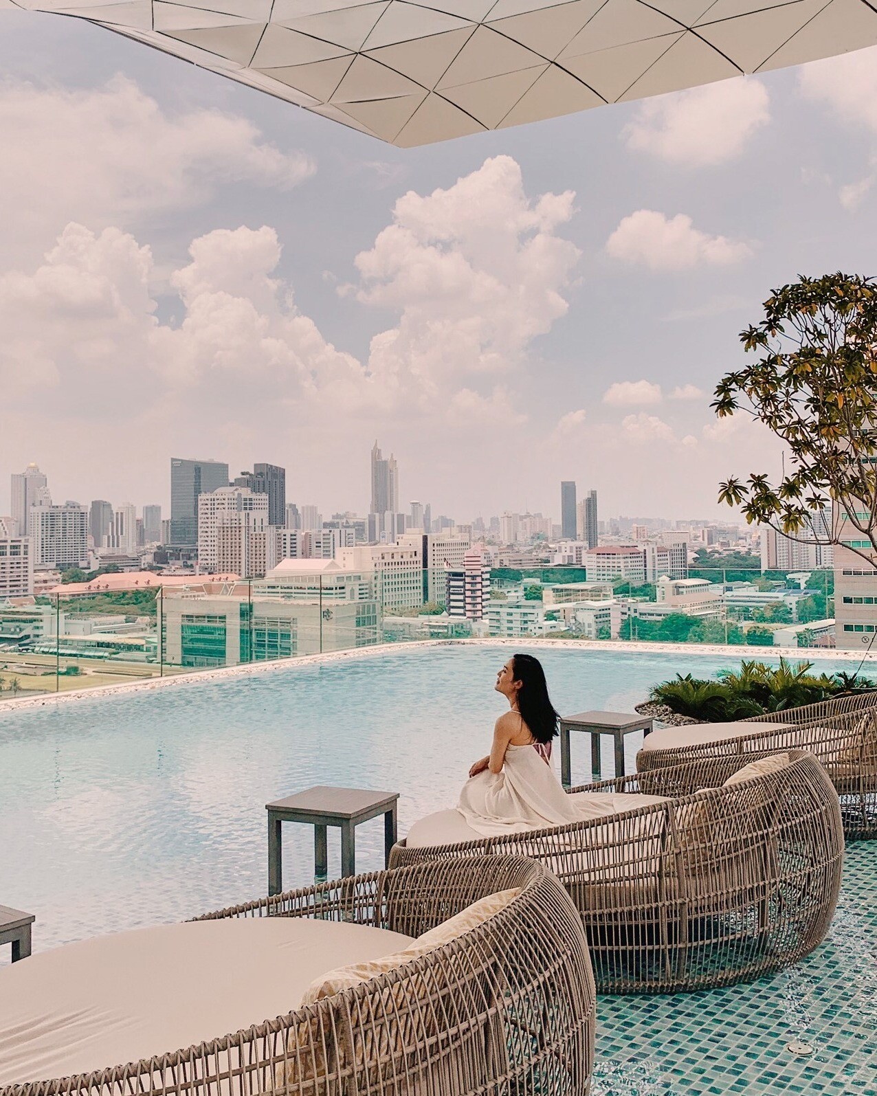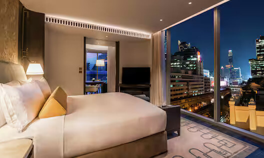 飯店提供 171 間寬敞客房與套房,配備落地窗景、Ferragamo 沐浴備品與獨立浴缸,每個轉角都藏著細緻品味。餐飲選擇更是星級級別──從主打現代牛排料理的 Bull & Bear、優雅細膩的 Front Room,到高空酒吧 The Loft 與 Champagne Bar,每一處都能欣賞曼谷夜空下的璀璨天際線。